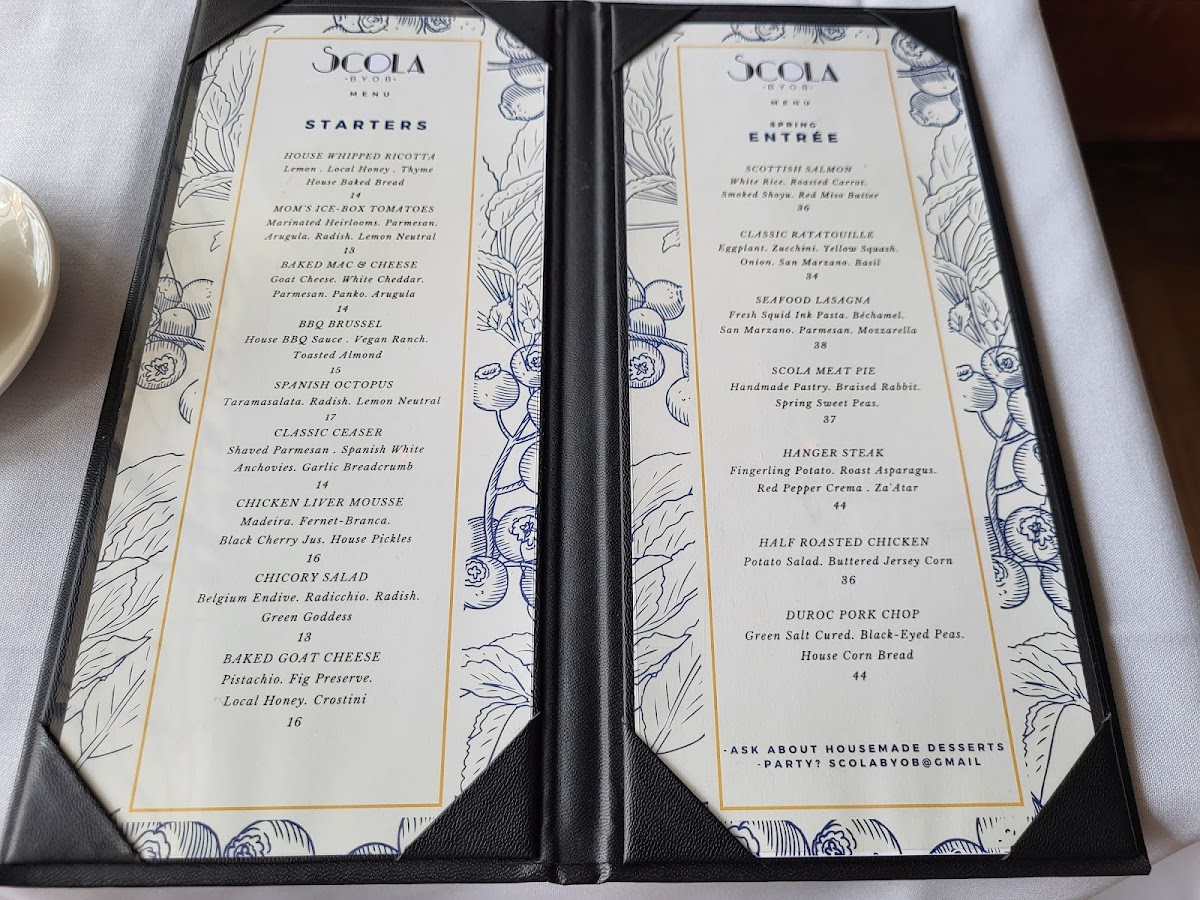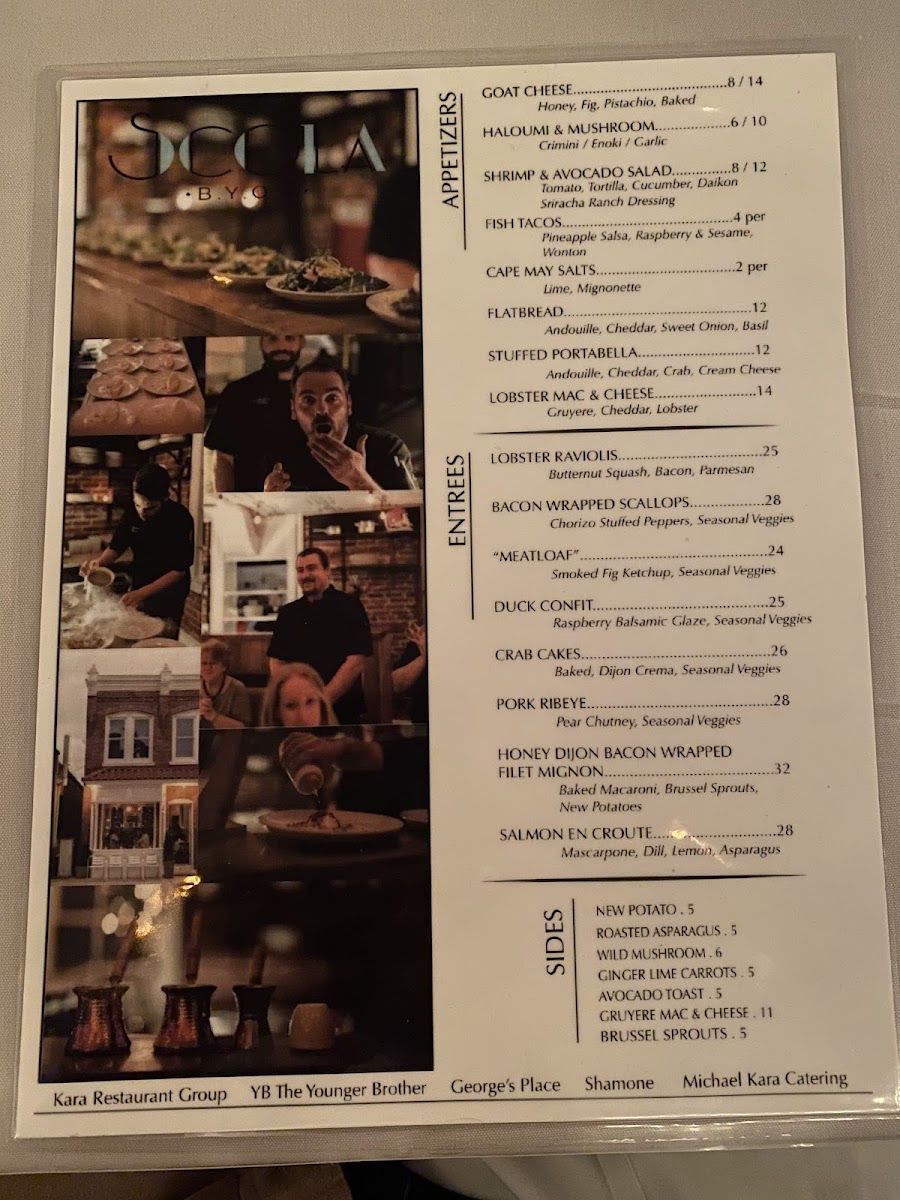 Welcome to Scola BYOB, a hidden gem nestled in Cape May Court House, NJ. With a menu bursting with creativity, Scola offers a delightful range of appetizers and entrees that promise to tantalize your taste buds. Start your culinary adventure with imaginative dishes like Fish Tacos or Stuffed Portabello, each priced affordably, making them perfect for sharing. For heartier fare, the Lobster Ravioli and Duck Confit shine with rich flavors, each accompanied by seasonal vegetables that elevate the dish.
